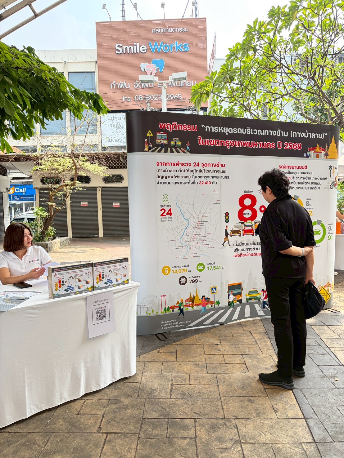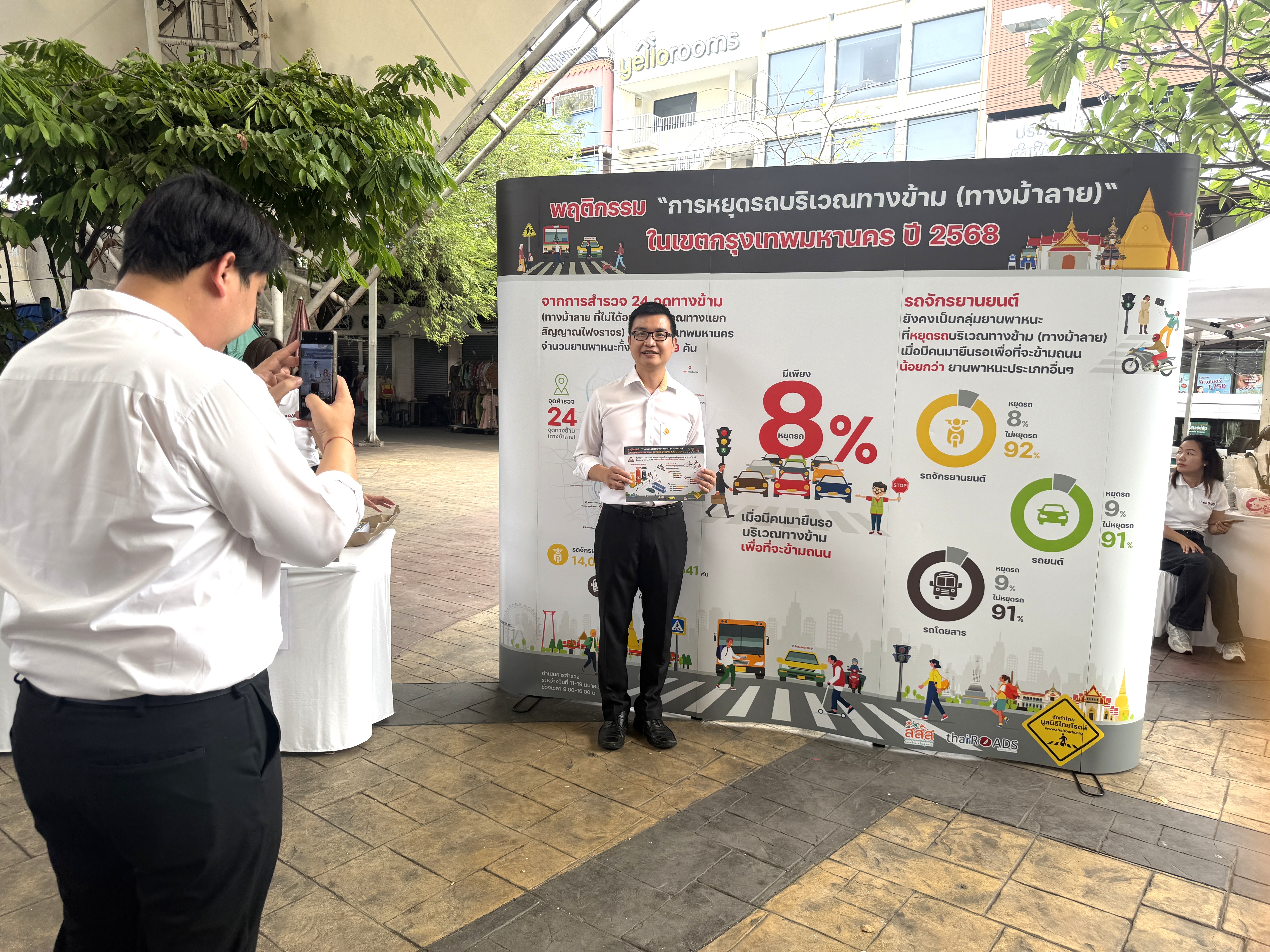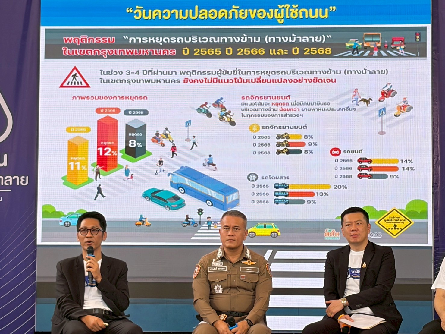 ในการนี้ มูลนิธิไทยโรดส์ นำโดย นายณัฐพงศ์ บุญตอบ กรรมการและผู้ช่วยเลขานุการมูลนิธิไทยโรดส์ ได้ร่วมเวทีเสวนา “สร้างพฤติกรรมการใหม่ ไม่ซ้ำรอย หยุดสูญเสียจากอุบัติเหตุบนถนน” เพื่อนำเสนอผลโดย สสส. ร่วมกับ มูลนิธิไทยโรดส์ ดำเนินการสำรวจพฤติกรรมการหยุดรถบริเวณทางข้ามหรือทางม้าลาย เขตกรุงเทพฯ จำนวน 24 จุด ที่อยู่ไกลทางแยกและสัญญาณไฟจราจร สำรวจระหว่างวันที่ 11-19 มีนาคม 2568 ครอบคลุมยานพาหนะทั้งสิ้น 32,419 คัน พบว่า ภาพรวมพฤติกรรมเมื่อมีคนเดินเท้ามายืนรอเพื่อข้ามถนน มีผู้ขับขี่หยุดรถให้เพียงร้อยละ 8 ในขณะที่ร้อยละ 92 เลือกที่จะไม่หยุดรถ ในกลุ่มรถจักรยานยนต์ เป็นกลุ่มที่มีการหยุดรถต่ำที่สุด โดยมีการหยุดรถเพียงร้อยละ 8 และมีพฤติกรรมไม่หยุดรถสูงถึงร้อยละ 92 กลุ่มรถยนต์และรถโดยสาร มีสัดส่วนการหยุดรถอยู่ที่ร้อยละ 9 และไม่หยุดรถร้อยละ 91