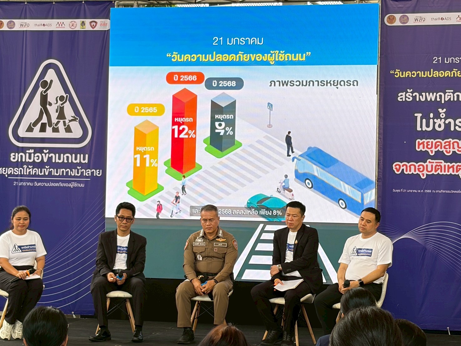 ขณะที่ นางก่องกาญจน์ ทักษ์หิรัญฤทธิ์ ผู้อำนวยการสำนักสนับสนุนการควบคุมปัจจัยเสี่ยงทางสังคม สสส. กล่าวว่า วันที่ 21 ม.ค. ของทุกปี คณะรัฐมนตรี (ครม.) และศูนย์อำนวยการความปลอดภัยทางถนน กำหนดให้เป็น “วันความปลอดภัยของผู้ใช้ถนน” เพื่อหยุดความสูญเสียจากอุบัติเหตุทางถนน ป้องกันการเกิดเหตุรถชนคนข้ามทางม้าลายซ้ำ พร้อมกระตุ้นเตือนและสร้างความตระหนักด้านความปลอดภัยแก่ผู้ใช้ถนนทุกเพศ ทุกวัย ส่งเสริมวินัยและการเคารพกฎจราจร สสส. ให้ความสำคัญกับการลดการบาดเจ็บและการเสียชีวิตจากอุบัติเหตุทางถนน ซึ่งถือเป็นปัญหาที่สำคัญของประเทศ ผ่านการสนับสนุนองค์ความรู้ทางวิชาการ การพัฒนาศักยภาพภาคีเครือข่ายทุกระดับ และการจัดการความเสี่ยงในพื้นที่อย่างเป็นรูปธรรม เช่น การรณรงค์สวมหมวกนิรภัยและการป้องกันการดื่มแล้วขับ โดยเน้นกลุ่มและพื้นที่เสี่ยง ควบคู่การมีส่วนร่วมของชุมชน องค์กรปกครองส่วนท้องถิ่น และการบังคับใช้กฎหมายอย่างจริงจัง เพื่อสร้างความปลอดภัยทางถนนอย่างยั่งยืน